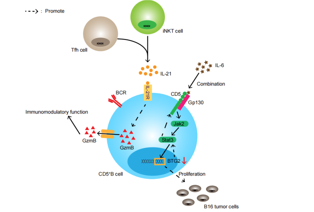 图1 CD5+ B细胞通过IL-6/STAT3通路促肿瘤,并通过GzmB参与免疫调节(源自论文Figure 1)