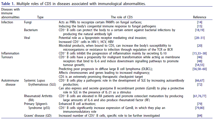 CD5在免疫相关疾病中展现出复杂的双向作用。它既参与抗感染(如识别真菌、调节病毒免疫)和抑制炎症(通过CD5⁺B细胞分泌IL-10),也在肿瘤微环境中促进进展(如激活IL-6/STAT3通路、预示不良预后)同时也可作为免疫治疗靶点(如抗体阻断、CAR疗法)。在自身免疫病中,CD5⁺B细胞的作用尤为矛盾:在SLE中兼具致病(产生自身抗体)和保护(分泌GzmB清除自身细胞)功能,而在RA和pSS中则主要驱动炎症和损伤。这些多重角色凸显CD5作为关键免疫调节分子的潜力,使其成为开发靶向疗法的重要对象,驱动着对其具体作用机制和调控网络的深入探索。