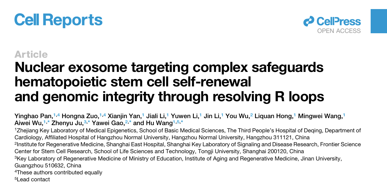 2025年12月,杭州师范大学基础医学院汪虎课题组联合同济大学高亚威团队、暨南大学鞠振宇团队在 Cell Reports 上发表了题为 “Nuclear exosome targeting complex safeguards hematopoietic stem cell self-renewal and genomic integrity through resolving R loops” 的研究论文。该研究聚焦于核外切体靶向复合物(Nuclear exosome targeting complex, NEXT),该复合物由 MTR4、RBM7 和 ZCCHC8 三个核心亚基组成,能够识别并将无 poly(A) 尾的非功能新生转录本导向 RNA 外切体进行降解。该研究揭示,NEXT 通过抑制转录耦链的R 环形成,从而在HSC中扮演基因组守护者的关键角色。