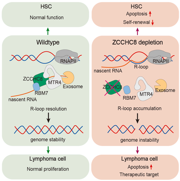 造血干细胞(hematopoietic stem cell, HSC)通过自我更新和多系分化维持机体终身造血功能。为维持其长期再生潜能,HSC 必须在生命周期中保持基因组稳定性,否则可能导致造血功能障碍甚至恶性血液疾病。哺乳动物基因组中广泛存在的转录过程会产生大量无功能新生转录本,进而形成 R 环(R-loop)——一种由 RNA-DNA 杂合链和游离单链 DNA 组成的三链结构。R 环若未被及时清除,可引发转录偶联的 DNA 断裂,严重威胁HSC的基因组稳定性和其长期再生能力。因此,及时清除无功能的新生转录本、预防R环积累,对维持HSCs功能至关重要,但其分子机制尚不明确。